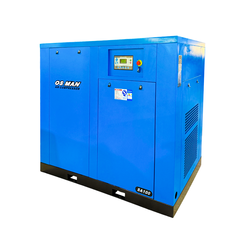 The 100HP Industrial Frequency Screw Air Compressor is designed for factories and workshops requiring continuous, high-quality compressed air. Equipped with a fully intelligent microcomputer control system and a user-friendly touchscreen display, this unit allows operators to manage the air compressor with minimal training. Key protective mechanisms such as motor overload shutdown, high-temperature stop, phase-loss protection, and automatic fault diagnosis ensure the system operates safely and efficiently, even in unattended 24-hour environments.   This 100 hp screw air compressor features constant-speed operation, delivering a stable airflow regardless of fluctuations in actual demand. The smart load-unload control manages the air supply efficiently: the compressor automatically stops when the tank pressure reaches the preset upper limit and restarts as the pressure drops to the lower threshold. This control strategy reduces energy waste, protects internal components, and maintains op…